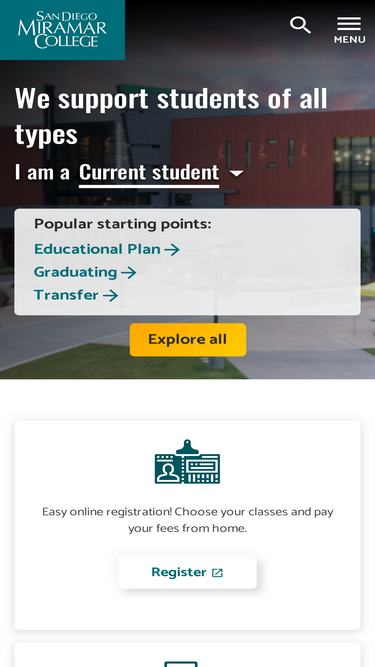 97%one of three colleges within the san diego community college district, san diego miramar college offers associate degrees, certificates of completion, and the first two years of a bachelor’s degree. founded in 1969, and located in mira mesa, the college services 14,000 students annually. the college offers 70 associate