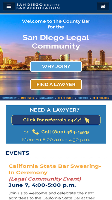 90%located downtown at 330 a street, the san diego county bar association (sdcba) is the hub of san diego's legal community. the mission of the sdcba is to be san diego county's representative of the legal profession, serving the public and the profession by enhancing the legal system and promoting justice, professional excellence and respect for the law. to find a lawyer, visit www.sdcba.org/lris.