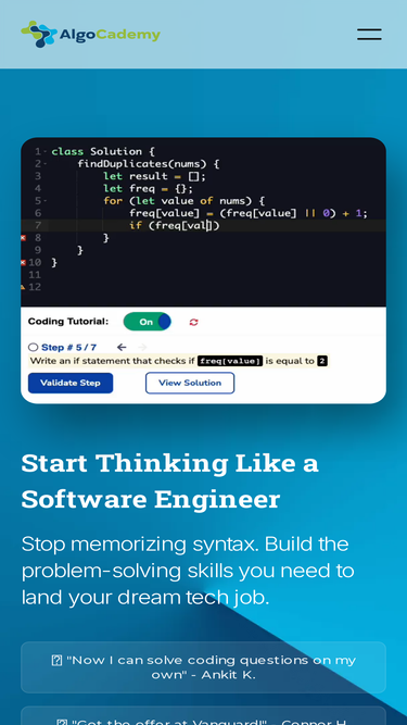 85%AlgoCademy’s interactive coding tutorials will help you master problem-solving skills and teach you the algorithms to know for coding interviews. Learn to write cleaner, high-quality code and really understand programming when you're done.
