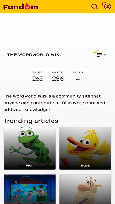 56%Welcome to The WordWorld Wiki! This wiki homepage is about the show WordWorld that anyone can edit! Please refer to the Rules page before editing. If you have any questions, please ask any of the bureaucrats & administrators. We currently have 401 articles Have a wonderful new year!