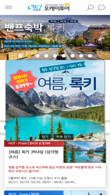 94%오케이투어는 최다 자체 버스 및 지사를 보유한 캐나다 최대의 1등 한인 여행사 입니다. 캐나다서부 여행의 록키투어, 로키투어, 밴프투어 및 크루즈를 전문으로 하며 퀘벡, 토론토, 옐로나이프 오로라 등의 다양한 캐나다 명소 투어와 미국 서부의 시애틀, LA, 그랜드캐년, 라스베가스, 미국 동부의 뉴욕, 아이비리그 등의 북미 전체 여행 서비스를 제공합니다.