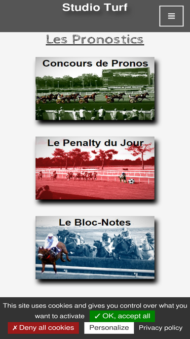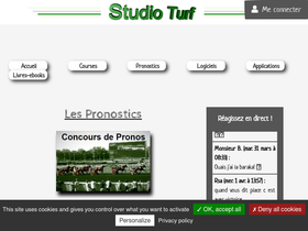 100%studio turf est une entreprise spécialisée dans les courses hippiques : concours de pronostics ouvert à tous, logiciels gratuits et payants d'analyse, de calcul et d'aide à la décision pour les courses hippiques pmu et pmh, méthodes pour jouer au turf, abonnement au penalty du jour par e-mail et sms sur téléphone portable, services aux turfistes: canasson futé, bloc-notes des chevaux repérés du jour et jumelles de nos pronostiqueurs. -