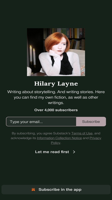 85%Writing about storytelling. And writing stories. Here you can find my own fiction, as well as other writings. Click to read Hilary Layne, a Substack publication with thousands of subscribers.