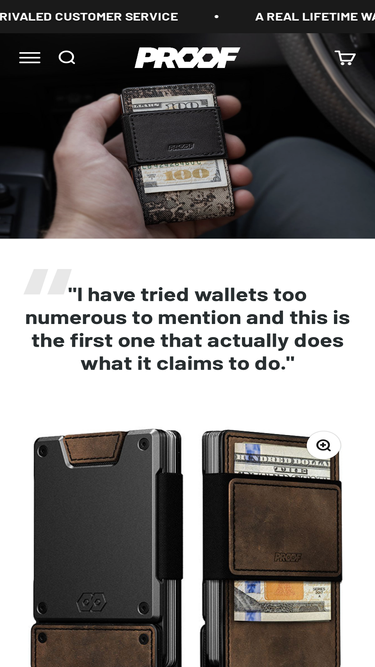 85%The Sentinel We've redefined minimalist wallets as you once knew them. Bland, cheap sheet metal sandwiching your cards is a thing of the past. The PROOF Wallet incorporates fine full grain leather, 1000D nylon, and aerospace metals into a sleek, ultra functional minimalist design. It allows carrying up to 25 cards safely and securely with built in RFID Blocking internal materials. We've topped it off with a snug cash strap on the back and an intuitive pull strap on the front for easy card access. We are so confident in our wallets' quality, we back it with our UNRIVALED Guarantee and no questions asked, full refund/return policy with no expiration date. With PROOF, minimalist wallets are no longer just for high school kids. Upgrade your wallet with a professional, durable, and ultra functional Proof Wallet. 2.25" W x 3.75" H x ~0.5" T (Based on card load) Weight: 49.5 Grams Materials: Full Grain Leather, Ballistic Nylon | Dark Gunmetal Aerospace Grade Aluminum Card Capacity: Up to 25 Cards & 20 Bills RFID Blocking Lifetime Warranty (A real one, not a deceptive "limited" lifetime warranty. If you have issues, we're solving them immediately — for life) No-Questions-Asked Full Refund/Return Policy ***Patent Pending***