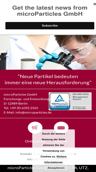 86%Linke Spalte microParticles GmbH Linke Spalte innen Volmerstr. 9A, H3.5.1D-12489 BerlinGERMANY Rechte Spalte innen Tel: +49 30 6392 2565Fax: +49 30 6392 2555E-Mail: info@microparticles.de Geschäftsführer:Dr. Karl-Heinz Lerche Registergericht: Amtsgericht Berlin CharlottenburgRegisternummer: HRB 63275Umsatzsteuer-Identifikationsnummer: DE 812 266 393 Rechte Spalte Haftungshinweis:Die microParticles GmbH übernimmt keine Haftung für Inhalte externer Links.Für den Inhalt verlinkter Seiten sind ausschließlich … Impressum weiterlesen →