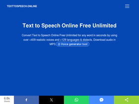 80%Text To Speech Online Free Unlimited. Service with natural sounding voices. Convert any text into MP3 audio file and download on your Mobile or PC.