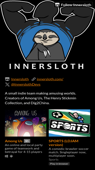 The other five competitors in the top 10 list are finji.itch.io, bay12games.com, innersloth.itch.io, papercookies.itch.io, and witchpotion.itch.io.