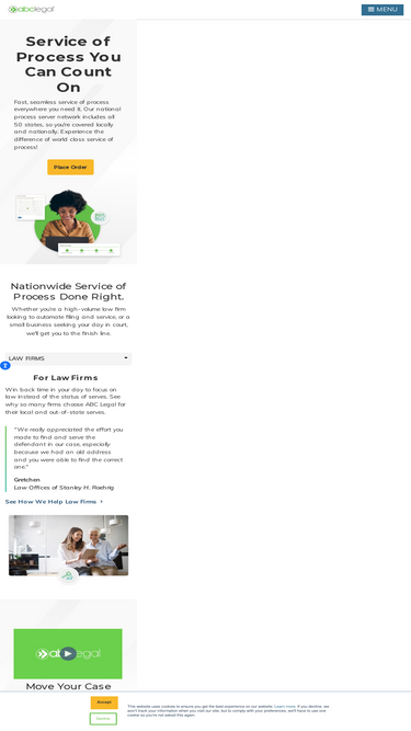 74%ABC Legal provides simplified legal document delivery across 50 states and 88 countries. Upload documents to local process servers, with GPS and photo evidence.