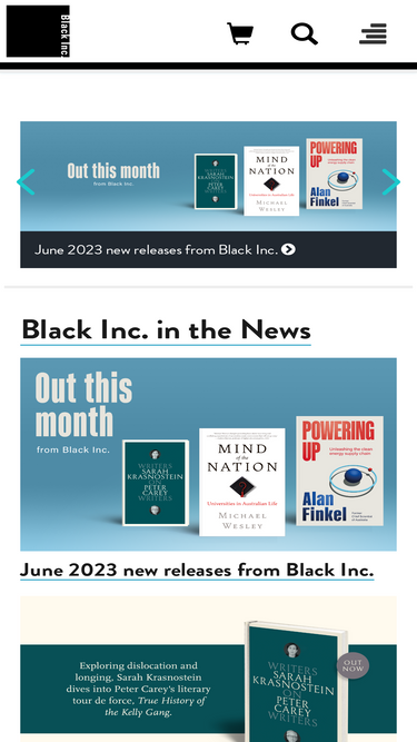 58%Black Inc. is an independent Australian publisher of quality non-fiction, fiction and poetry, based in Melbourne. Our imprints include the Quarterly Essay journal, and Nero and La Trobe University Press books.