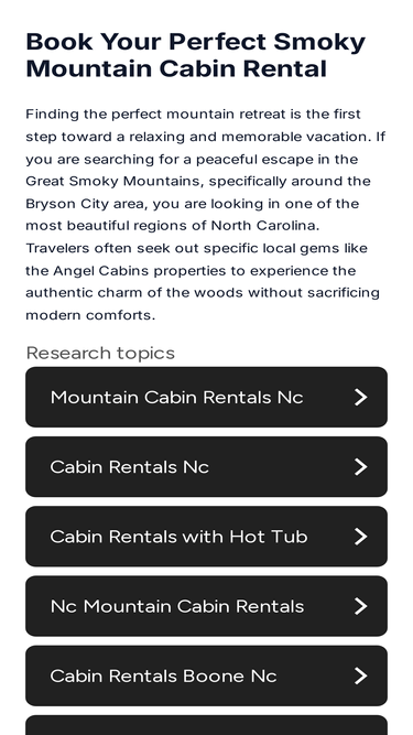 89%Just one-quarter mile from Deep Creek in the Great Smoky Mountains National Park. Open all year. Affordable rates. Choose from 5 furnished, private, secluded and romantic log cabins feature exceptional beds and linens, hot tubs, direct TV and all amenities for a great North Carolina mountain vacation near Bryson City NC.