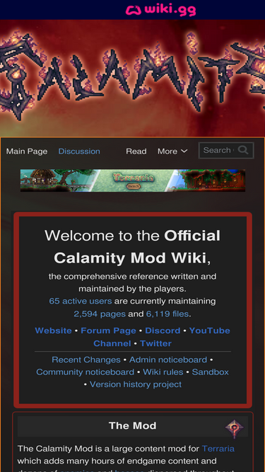 90%The Official Calamity Mod Wiki is a complete resource for the Calamity Mod of Terraria, including gameplay, crafting, armor, and enemies.