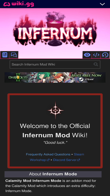 83%About Infernum Mode V • D • E • PResourcesMechanicsandSupportCalamity andTerraria changesAcquisition of Abyss itemsRage and Adrenaline tweaksAltered world-generationBoss RushRebalanced itemsInfernum mechanicsDeath WishesDev WishesInfinite flightBoss health barPlayer resourcesMod CallsCredits...