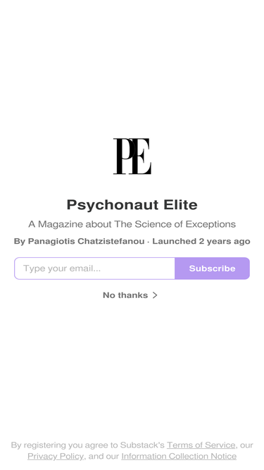 76%a magazine about the science of exceptions. click to read psychonaut elite, by panagiotis chatzistefanou, a substack publication with hundreds of subscribers.