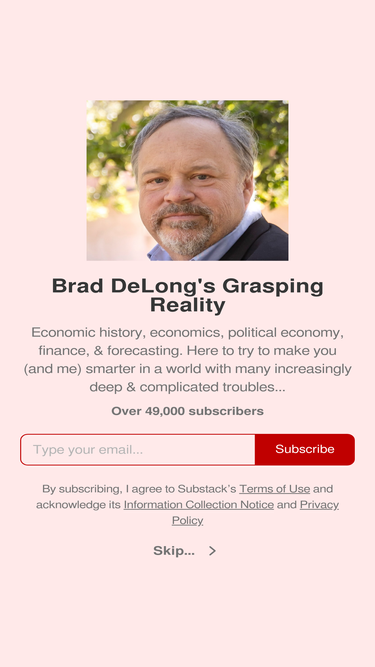 75%Economic history, economics, political economy, finance, & forecasting. Here to try to make you (and me) smarter in a world with many increasingly deep & complicated troubles... Click to read Brad DeLong's Grasping Reality, a Substack publication with tens of thousands of subscribers.