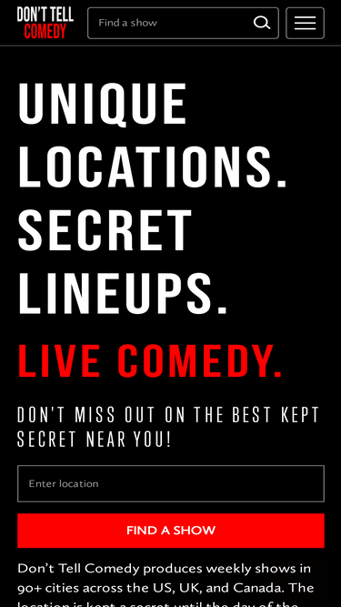 85%Don't Tell Comedy offers live comedy shows like never before. Secret comedians. Unique locations. No 2 drink minimums. Get tickets to shows in over 100 cities!