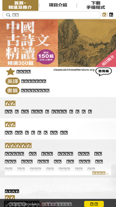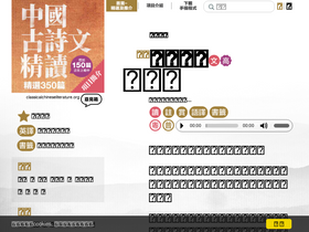 72%精選500篇古詩文,配以朗讀(普/粵)、註釋、譯文、導賞、創作背景、作者介紹、繁/簡字體,部分作品提供英譯。 由先秦至晚清,涵蓋詩經、古詩、論語、禮記、諸子百家、楚辭、辭賦、古文、唐詩、宋詞、元曲及小說等,包括歷代過百多位著名作家: 李白、杜甫、蘇軾、白居易、李煜、陶潛、李商隱、李清照、辛棄疾、韓愈、柳宗元.....等等。