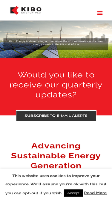 would you like to receive our regular updates? subscribe to e-mail alerts a clear strategy for value kibo energy plc (“kibo” or the “company”) is a multi-asset, africa - focused energy company positioned to address the acute power