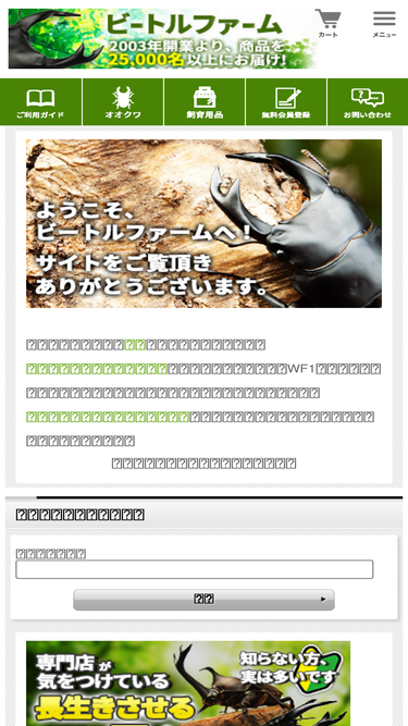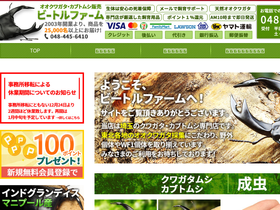 76%ビートルファームは2003年開業の通販・店舗販売をおこなう専門店です。国産オオクワガタは店主自ら採集もおこない産地にこだわっています。他にも国産・外国産問わず各種クワガタ・カブトムシを取り扱っています。専門店が選んだ飼育用品も充実。飼育方法などのご相談もお気軽に!初心者の方からブリーダーまで幅広くご満足頂けるようなお店作りを心がけています。