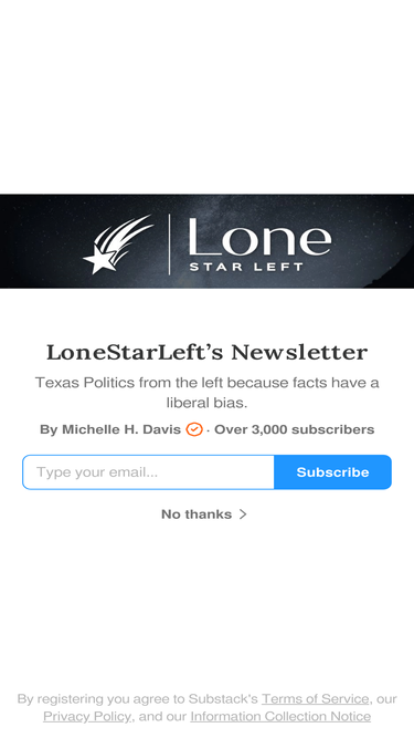 85%Analysis and commentary on Texas Politics from the left. Click to read Lone Star Left, by Michelle H. Davis, a Substack publication with tens of thousands of subscribers.