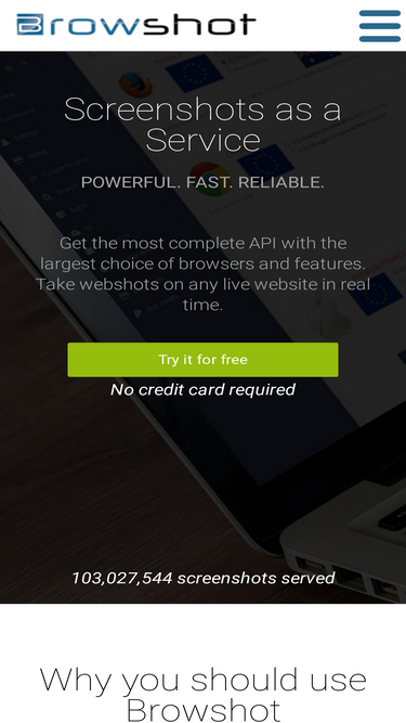 73%browshot is a service to take screenshot of web pages. use any of our mobile and desktop browsers. we provide a powerful api and libraries.