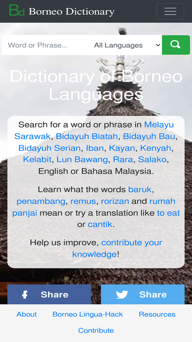 Lun Bawang dictionary and word list with translations in English and Bahasa Malaysia. Lun Bawang is spoken in Sarawak, North Kalimantan, Brunei and Sabah.