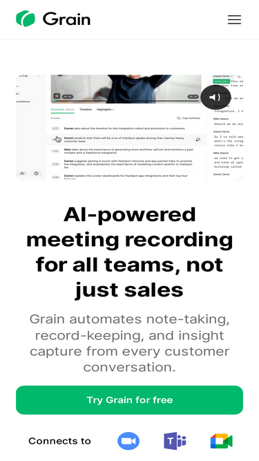 85%Explore Grain's AI-powered meeting enhancements, featuring intuitive navigation, AI-generated summaries, and streamlined highlight creation for improved collaboration.
