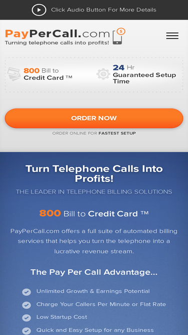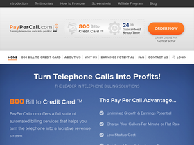 100%PayPerCall.com offers a full suite of automated telephone billing services that help you turn the telephone into a lucrative revenue stream, including: 800, and 900 numbers, billing & collection, programming and reporting.