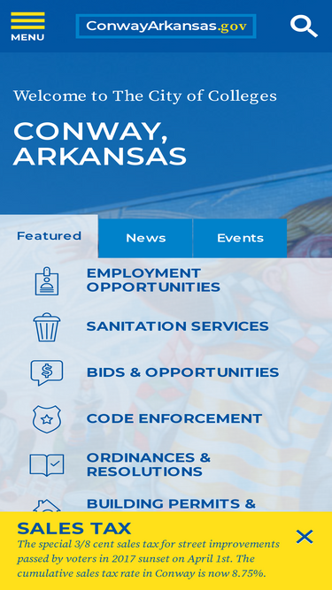 Welcome to the City of Colleges Conway, Arkansas! Here you can learn about what the City of Conway government is doing to help improve our community. Find upcoming events and recent news.
