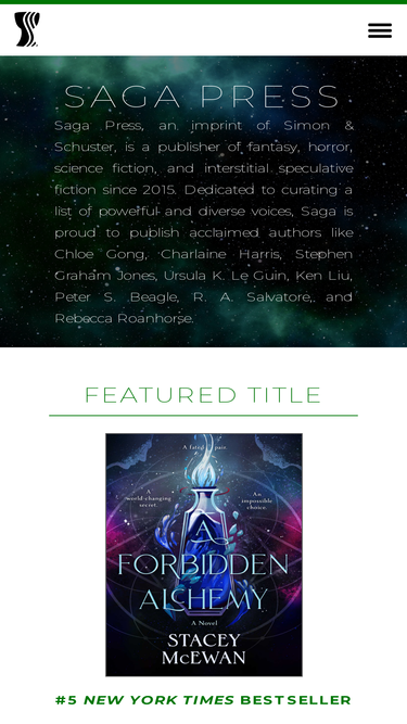 74%SAGA PRESS, an imprint of Gallery Books and Simon & Schuster, is a publisher of award-winning speculative fiction. Dedicated to curating a bespoke list of powerful and diverse voices, Saga is proud to publish acclaimed authors like Amal El-Mohtar, Charlaine Harris, Stephen Graham Jones, Ursula K. Le Guin, Ken Liu, and Rebecca Roanhorse.