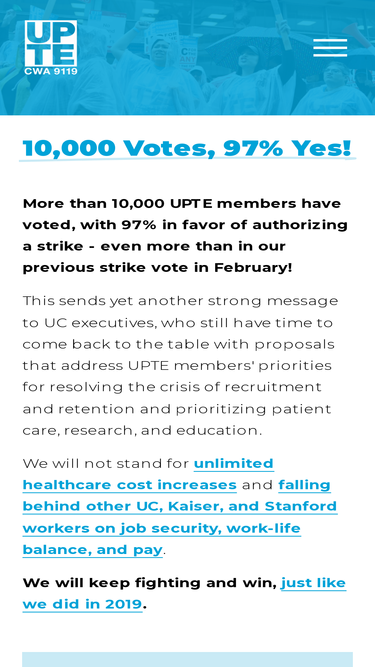 72%Watch and share our first Dispatch from Negotiations on Facebook , Instagram , Twitter , or Threads . “Our first month of bargaining with the University of California for UPTE healthcare, research, and technical members is in the books and our solidarity was on full display all month.