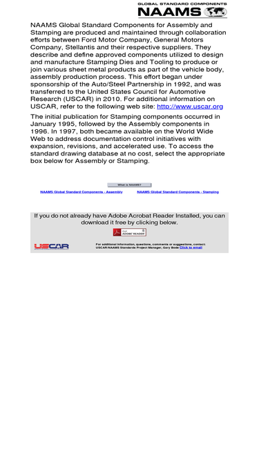 the naams global standard components - stamping and assembly are produced and maintained in a joint effort by daimlerchrysler corporation, ford motor company, general motors corporation and their suppliers. they describe and define the components that have been adopted as standard by those companies when designing and constructing stamping dies and body assembly tools for sheet steel body components. the effort is conducted under the sponsorship of the auto/steel partnership.