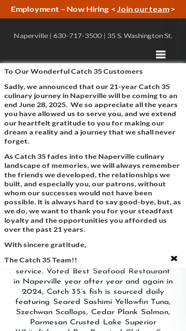 92%Welcome to Catch 35 Naperville! Catch 35 is a modern American restaurant located in downtown Naperville offering fresh seafood, premium steaks, burgers, pastas, coastal wines, cocktails with a cozy elegant atmosphere and great service. Voted Best Seafood Restaurant in Naperville year after year and again in 2024, Catch 35’s fish is sourced daily featuring Seared […]