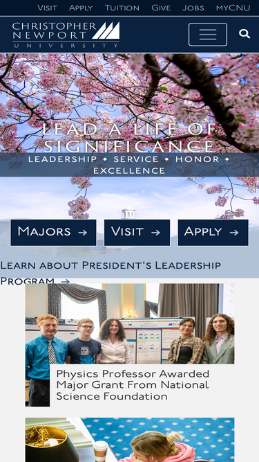 100%A four-year public liberal arts and sciences university in Newport News, Virginia, Christopher Newport offers great teaching and small class sizes with an emphasis on leadership, civic engagement and honor.