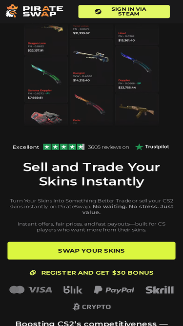 78%instantly sell your cs2 skins for cash or trade them for other skins on pirateswap, the best cs2 trade bot and skin exchange on the web! fast and 100% secure.