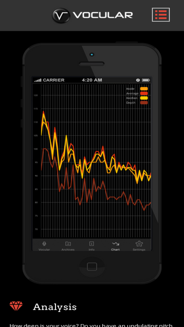 76%Vocular analyses your voice to tell you how deep it is, how varied or monotone it is, and which celebrities you match with from a set of 150+ voices.