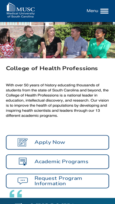 77%Explore MUSC's College of Health Professions, offering top-ranked, flexible programs in healthcare studies, health administration and more.