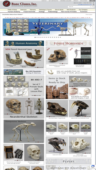 b'All photographsBone Clones, Inc.B O N E C L O N E S, INC.OSTEOLOGICAL REPRODUCTIONS B O N E C L O N E S, INC.Only Mother Nature Does It Better TM OSTEOLOGICAL REPRODUCTIONSSkulls & Cranial PartsSkeletons & Postcranial PartsSets, Life Casts, Scale & SculptureLesson Plans & Printable HandoutsBasic & Advanced AnatomyForensics, Pathology, TraumaPaleontology, BioarcheologyPhysical AnthropologyPhysical TherapyPrimatologyVeterninaryZoologyBONE CLONES, INC. 2020C a t a l o g o f PRODUCTS2020$8 95Recycled Paperinfo@boneclones.com www.boneclones.com 818-709-7991 (U.S.) 800-914-0091 www.boneclones.com'