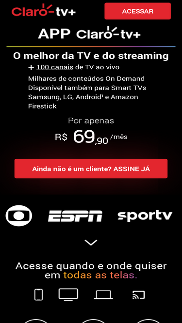 Da TV ao celular, assista na melhor tela para o seu estilo de vida. A Claro tv+ tem de tudo! Séries, notícias, realities, desenhos, lançamentos do cinema e muito mais.