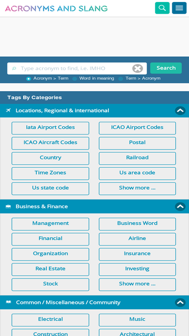 73%acronyms and slang - search through 3 million meanings of acronyms, abbreviations, urban and internet slang online. find every definition of acronym easily. quickly find zip code for location, airport code or u.s. state code. search through military acronyms, business, common, medicine, organisations abbreviations.