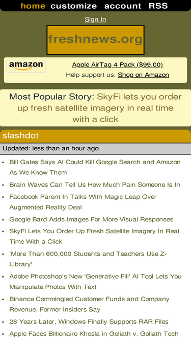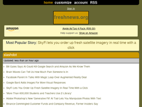 79%fresh tech news gathered from around the web. sites such as slashdot, gizmodo, engadget and hacker news are represented.