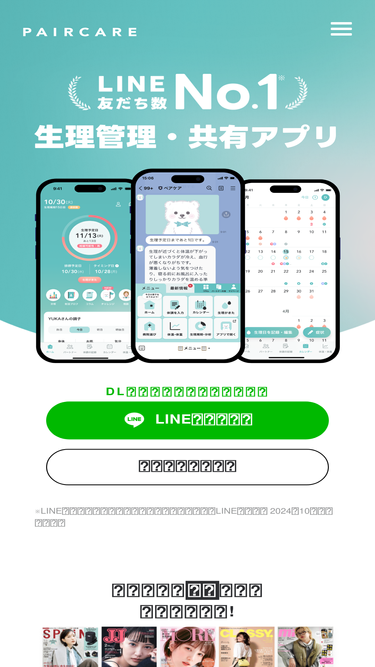 69%LINE友だち登録数80万人を突破!LINE公式アカウント「ペアケア」へようこそ。ペアケアはLINEに友だち登録するだけで、簡単に生理日予測・パートナー共有ができるサービスです。