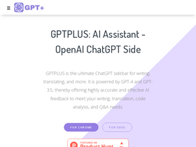 93%gptplus, a chrome extension for chatgpt, is powered by gpt-4 and gpt-3.5. it will provide the most accurate and effective ai answers to your writing, translation, code analysis and q&a needs. you can always chat and interact with chatgpt ai assistant in the sidebar.