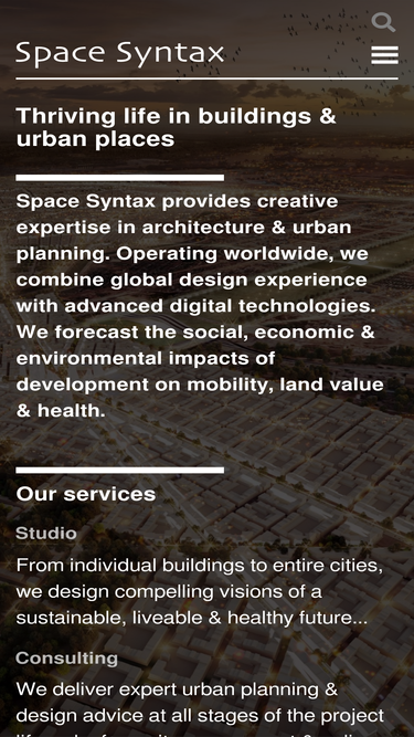 82%An integrated team We are a practice of architects, urban planners, policy analysts, data scientists, digital developers, project managers, communications, operations & finance specialists. Our core values Mission Our mission is to support the UN Sustainable Development Goals by applying, developing and disseminating the Space Syntax approach: a science-based, human-focused set of techniques for the