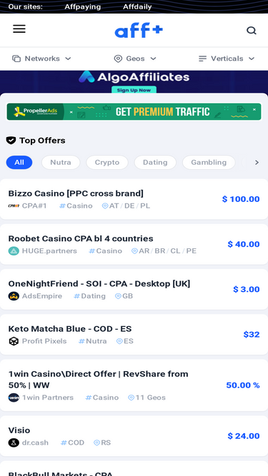 69%affplus - search, compare and choose the best cpa affiliate offers from the best affiliate networks. compare offer payouts, preview landing pages, check offer details and more.