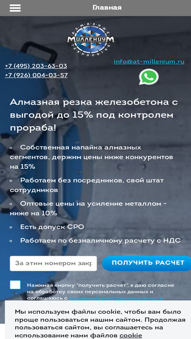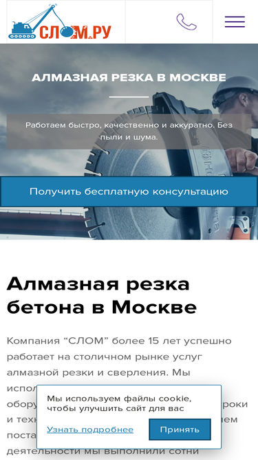 98%алмазная резка в москве и московской области. гарантируем высокий уровень качества работ и соблюдение сроков. свяжитесь с нами для консультации через форму на сайте или по телефону +7(499) 409-78-19 ☎
