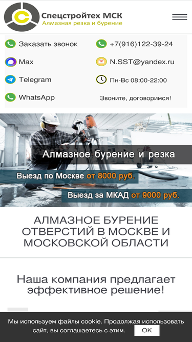 100%алмазное бурение отверстий в москве и московской области. выезд в день заказа! работаем без выходных! заказать услугу +7 (916) 122-39-24.