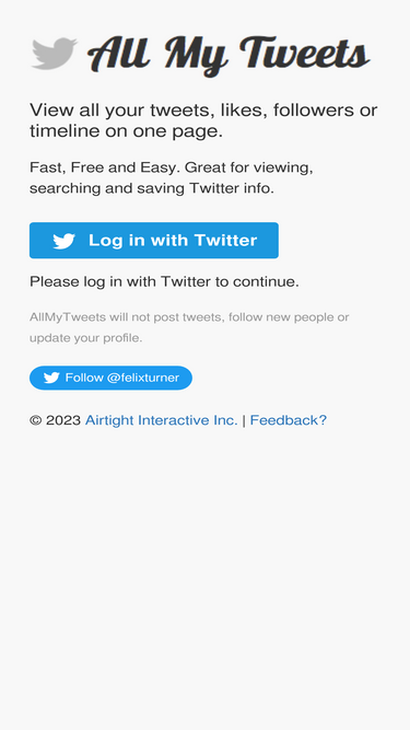 100%View all tweets from any Twitter user on one page. Fast, Free and Easy. Great for viewing, searching and archiving old tweets.