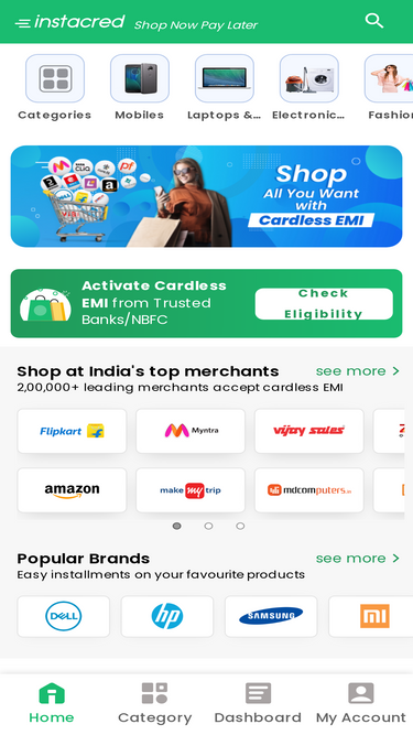 82%emi on mobiles, laptops, electronics, fashion, furnishing & more. shop with instacred cardless emi, no cost emi, flipkart emi, amazon emi, idfc emi, hdfc emi, icici emi, kotak emi
