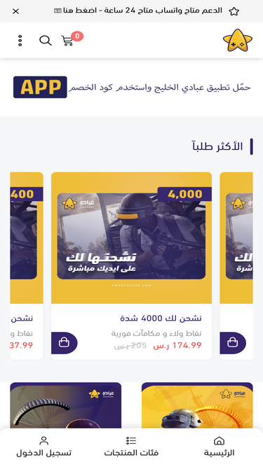 95%اشحن العابك بضغطة زر مع تطبيق عبادي وتمتع بأفضل الخصومات والأسعار و لاتنسى بطاقاتنا الرقمية من آيتونز و بلايستيشن و بطاقات التسوق العديدة مثل نون وامازون وغيرها الكثير