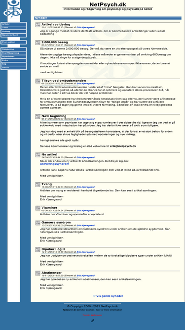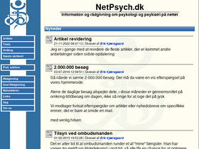 68%netpsych.dk er en omfattende hjemmeside om psykologi og psykiatri. vores mål er at udbrede viden om disse emner i et let tilgængeligt sprog. bl.a. mere end 100 artikler, ordbog med over 2000 ord inden for psykologi/psykiatry, professionel sektion, tests, forum, selvhjælp, brevkasse og ugentligt nyhedsbrev.